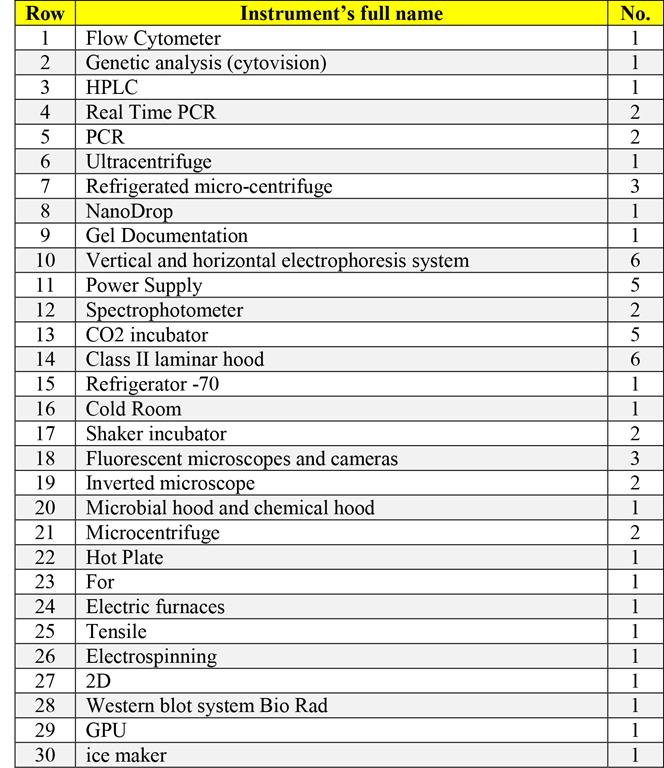 The units under the supervision of the center are cell laboratory, genetic engineering laboratory, tissue engineering laboratory, animal testing, culture rooms, biohazard laboratory, instrumental analysis, information technology hall and optics laboratory. The research center has trained over 300 experts since its establishment.