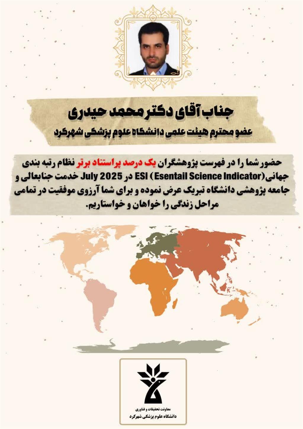 دکتر محمد حیدری به عنوان پژوهشگر 1% پر استناد برتر معرفی شد.